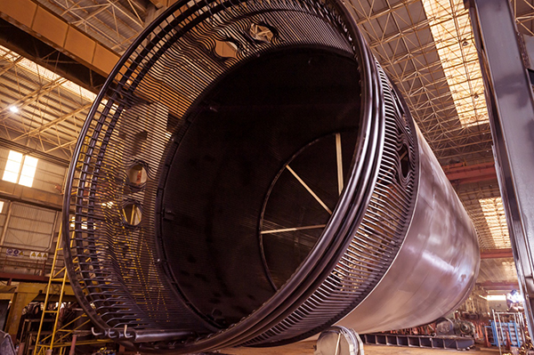 公司承制的余熱排出系統(tǒng)水冷壁設(shè)備系高溫氣冷堆核電站中第一大件,為國內(nèi)乃至國際首臺,也即將成為高溫氣冷堆示范工程第一個到貨的超大件。余熱排出系統(tǒng)水冷壁主要用于吸收反應(yīng)堆壓力容器表面釋放的熱量,并通過水冷壁內(nèi)的冷卻水將熱量帶出反應(yīng)堆艙室,保證反應(yīng)堆壓力容器與混凝土艙室溫度不超過規(guī)定限值。整個水冷壁包括水冷膜式壁、外支撐圈、隔熱板、冷卻水管、聯(lián)箱、出入口主管、錐形支撐底座等,其安裝方式為環(huán)繞反應(yīng)堆壓力容器垂直放置。該設(shè)備外形尺寸φ8726×19096mm,尺寸大、運(yùn)輸超限、安裝間隙小、精度要求高,對制造成形、組裝、焊接、無損檢測、水壓試驗(yàn)、氣壓試驗(yàn)及搬運(yùn)吊裝運(yùn)輸都帶來了很大困難。尤其是制造尺寸超限,設(shè)備整體組裝只能在江邊碼頭進(jìn)行,寒冬臘月,江風(fēng)刺骨;冷冽的寒風(fēng)中,項(xiàng)目制造管理團(tuán)隊(duì)始終保持飽滿的工作熱情,面對困難迎難而上,攻堅(jiān)克難。針對本設(shè)備結(jié)構(gòu)的特殊性,結(jié)合現(xiàn)有設(shè)備、工藝裝配、檢測手段、質(zhì)量管理要求設(shè)計(jì)了專用的水冷壁內(nèi)外支撐工裝、分片膜式壁吊運(yùn)工裝、水冷壁整體運(yùn)輸工裝、水冷壁整體垂直吊裝工裝等,編制了完整的操作規(guī)程、工藝執(zhí)行文件、質(zhì)量計(jì)劃、焊接工藝、檢驗(yàn)方案等,為產(chǎn)品質(zhì)量提供了有力的支撐和保證。最終,產(chǎn)品制造質(zhì)量獲得了業(yè)主和設(shè)計(jì)院的一致好評,順利通過驗(yàn)收。